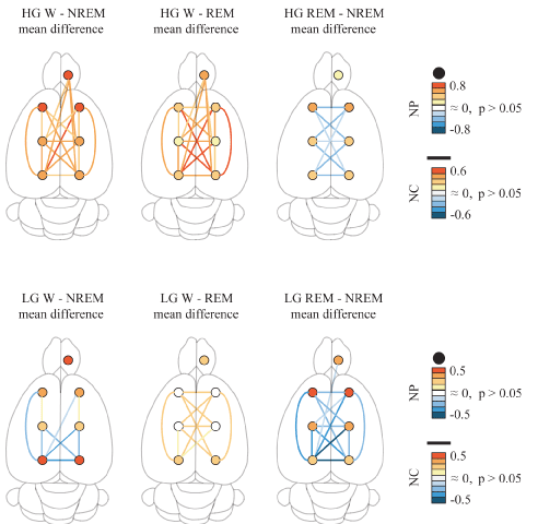 Coherence for high gamma during W was higher than during NREM sleep and REM sleep across all the combinations of cortical loci. However, low gamma coherence differences between W and NREM sleep varied between different cortices (Figure 4) [23].