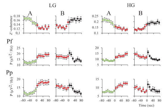 Analyses of 10-second epochs were also used to determine the temporal dynamic of power and coherence. Hence, low and high gamma power and coherence were normalized, and referred to as normalized power (NP) and normalized z'-coherence (NC). For dynamic analysis (see Results), normalization was undertaken by dividing each value by the maximum value (of either power or coherence) recorded in each analyzed segment. For statistical analysis, the normalization was performed for each animal by dividing each mean value by the maximum-recorded value.