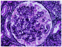 Figure 1B. Silver stain highlights collapse of capillary tufts associated with hypertrophy/ hyperplasia of overlying epithelial cells.