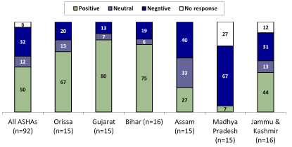 Many ASHAs had difficulty with new reporting requirements. ASHAs, who on the whole have low levels of literacy, found the multiple new forms and registers burdensome. For their other responsibilities, ASHAs frequently seek the support of ANMs: a 2009 five-state evaluation noted that over three quarters of ASHAs expressed a need for support from ANMs [14]. Under this initiative, however, the ANMs were omitted from the guidelines and orientation requirements, leaving them poorly equipped to support the ASHAs.