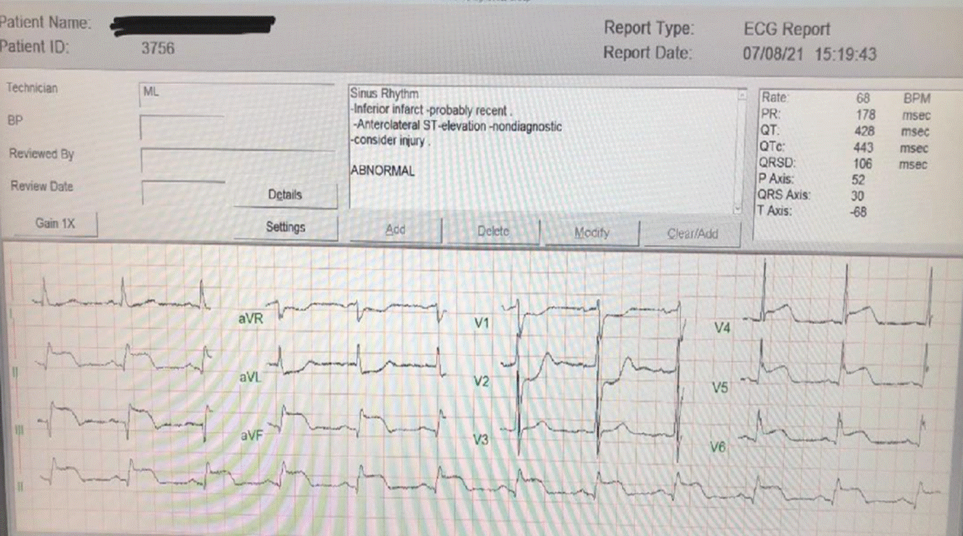 Due to the patient’s past medical history of CAD and the negative cervical spine and shoulder exam, an ECG was obtained in office (Figure 1). Upon review of the ECG, the patient and his wife were informed of the findings and EMS was contacted. The patient was transported to the local emergency room where a repeat ECG was obtained, again revealing ST elevation in leads II, III and aVF. Labs obtained in the ER revealed an elevated troponin I at 3.65 ng/ml. The patient was started on a Heparin drip and given aspirin. He underwent an emergency cardiac catherization procedure, which revealed an area of heavily calcified stenosis with a superimposed clot at the bifurcation of the posterior lateral branch and LV branch at the crux (Figure 2). Subsequently, a drug-eluting stent was placed into the RCA and the patient was transferred to the CVICU. The patient remained stable after stent placement and was subsequently discharged on aspirin, Brilinta, lisinopril and a high-intensity statin.