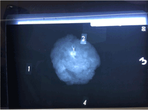 After the exeresis completed, another image study is made to the extracted piece to check the presence of the irregularity that caused the procedure and is marked with a needle to specifically orient the pathologist where the abnormality is Figures 4A and 4B.