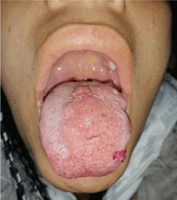 Young patient of 13 years, in good health, consults for asymptomatic lesions of the tongue evolving since birth.