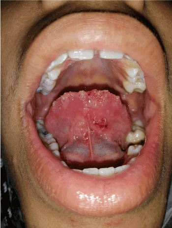On examination, we noted, on the dorsal surface of the tongue, a hypertrophic plaque, made of multiple yellowish and translucent vesicles, they are hematic in places, the lesion overflowed on the free edge, without reaching the floor of the tongue. No deep mass was found.