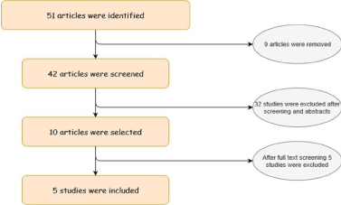 A total of 51 studies were identified and inclusion criteria was applied as illustrated in Figure 1. After careful evaluation of titles, abstract, full text analysis and screening 5 studies were found to meet the inclusion criteria and were included for meta-analysis. A study which has a total of 1481 patients, out of which 807 patients underwent LACS and 674 underwent RACS. Another study was taken where 18 were right hemicolectomy, 1 sigmoidectomy, 3 abdominoperitoneal resection, 3 low anterior resection and 4 concomitant liver resections. Both the studies were used to compare Robotic and Laparoscopic methods of 2 different set of patients [10,11,23,24]. Comparison of operating time, estimated blood loss, hospital stay, probability of complication, probability of anastomic leak and mortality for various patients is demonstrated in Figure 2.