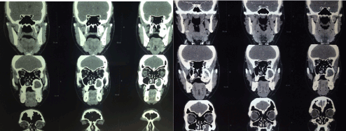 27 year old male patient admitted to our clinic with complaints of swelling in hard palate and toothache. Medical history was unremarkable, and general health condition was well. On physical examination, a 4x5 cm soft mass was seen on the middle part of the hard palate. The overlying mucosa was intact and bony consistency of the hard palate could not be palpated. Nasal endoscopy was unremarkable.