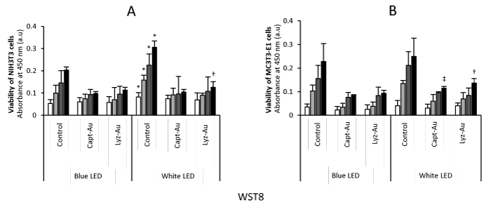 (A) Viability of NIH3T3 cells. (B) Viability of MC3T3-E1 cells. *, P<0.05 vs. control after blue LED irradiation; †, P<0.05 vs. Capt-Au clusters after blue LED irradiation; ‡, P<0.05 vs. Lyz-Au clusters after blue LED irradiation.