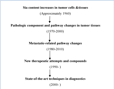 Sialic acids (Sias, neuraminic acid) are a special series of 9-carbon backbone negatively charged carbohydrates and typically found at terminal sugar chains attached to cell glycoconjugates. They play critical roles in many physiological and pathologic processes, including inter-molecular binding that leads to microbial infections, regulation of the immune response, the progression/spread of human malignancies and in certain aspects of human evolution [14-16]. The earliest work tackling the close relationships between sias and tumors was traced back to Kimura et al from 1958 [17-18]. They discover that tumor cells might excrete and contain higher level of sias-containing glycoproteins. These characteristic later have been linked to highly metastatic tumor types [19,20]. Since then, numerous literatures showed similar data and lab findings [9-11]. Major milestone of this research can be mainly represented as follows (Figure 1).