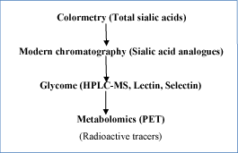 Due to multiple reasons, we must pay more attentions to the regulation and functions of sias in cell, especially in cancer cells for diagnostic/therapeutic purposes. More realistic diagnostic models must be established. These researches have also been undergone. The commonest and sophisticate way to the study on the regulations of sias was glycome in the past [31-33]. Glycomes of sialylations mainly consist of lectin- or selectin-binding techniques or modern chromatography combined with mass-spectrometry. They demanded modern technology and instruments for glycome study comparing with colorimetry techniques for total sias contents and HPLC and/or GC method combined with fluorescence and/or electro-conductive detectors for sias analogues (Figure 2) [25]. Since more than 60 types of sias have been discovered until now, they are evolutionary and oncology related. Future new technologies will help us to understand these relations in quicker and easier ways. In addition, new technologies, especially in related with glycome and proteomics, immuno-histological tools and HPLC-MS can provide detailed biomedical information about small changes of sias in tumors. It might give birth to new round of remarkable and innovative therapeutic study with sias-related pathways and tumor metastasis pathogenesis. Apart from that, some other technology and genetic means currently negligible, such as epigenetic considerations of sialylations in tumors might also be some important topics in future.