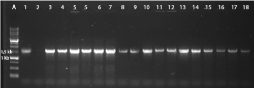 A total of 33 clones were confirmed for the ability to use nitriles as the sole nitrogen source and were submitted to gene screening using conventional PCR. PCR amplification with the amidase primers is shown in Figure 1. All the results of the DNA fragments amplifications are shown in Table 2.