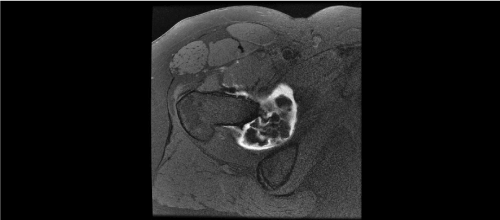 Figure 2b. Axial T1-Wieghted image (Right) showing hyperintense masses highly suggesting of synovial chondromatosis of right hip