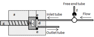 Figure 1. Schematic drawing of the continuous flow chamber (a). The block (b) containing the embedded enamel specimen with the agarose gel facing the chamber (c) is positioned into the acrylic device (d), which is sealed with a rubber O-ring (e). Fluid is flowing towards the chamber and the free end tube, used for fluoride treatments, is closed using a switch valve (f). A screw was used to hold the block in position (g).