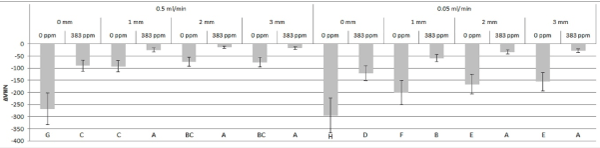 Remineralizing solution flow rate effect: Flow rate of 0.5 ml/min was more protective against demineralization than 0.05 ml/min for 0 mm artificial biofilm thickness (P = 0.0002) regardless of fluoride concentration, for 1 mm thickness (P < 0.0001) regardless of fluoride concentration (although the effect size was smaller due to flow rate effect for 383ppm vs. 0 ppm F), for 2 mm thickness with 0 ppm F (P < 0.0001), and for 3 mm thickness with 0 ppm F (P < 0.0001). There was no significant effect of flow rate for 383 ppm F with thickness of 2 mm (P = 0.07) or 3 mm (P = 0.31).
