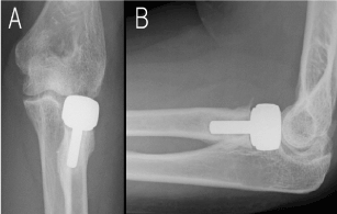 Figure 2.A The anteroposterior radiograph shows radial head replacement B. The lateral radiograph shows radial head replacement.