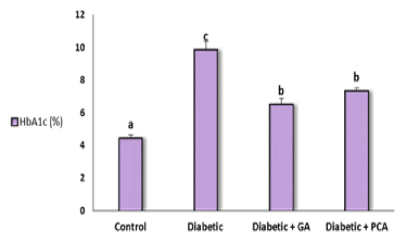 Figure 1. Glycosylated hemoglobin, HbA1c, (%) of control, diabetic and diabetic rat treated with gallic acid and p-coumaric acid.