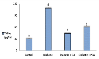 Figure 2. Tumor necrosis factor alpha (TNF-α) of control, diabetic and diabetic rats treated with gallic acid and p-coumaric acid.