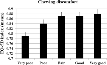 Results: The EQ-5D index scores decreased as chewing difficulty worsened. The adjusted EQ-5D index mean scores were lowest in the very poor group compared to the other four groups (ANCOVA, P = 0.001). The chewing difficulty was independently associated with the EQ-5D index scores throughout the adjustment process in the model (β coefficient = -0.040; P = 0.001).