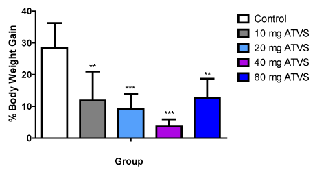 The animals were randomly selected on the basis of average weight into five study groups of six rats each. 10 mg of Atorvastatin (ATVS) was solubilized in 40 ml of distilled water and made into a concentration of 0.25 mg/ml. After acclimatization period, the rats were subjected to different dosages of the drug with group 1 (control) receiving an equivalent volume of water as placebo. The test groups: 2-4 received oral doses of 10, 20, 40 and 80 mg ATVS/ kg body weight for 28 days respectively. The body weights were measured prior and after the experiment to determine body weight changes (if any).