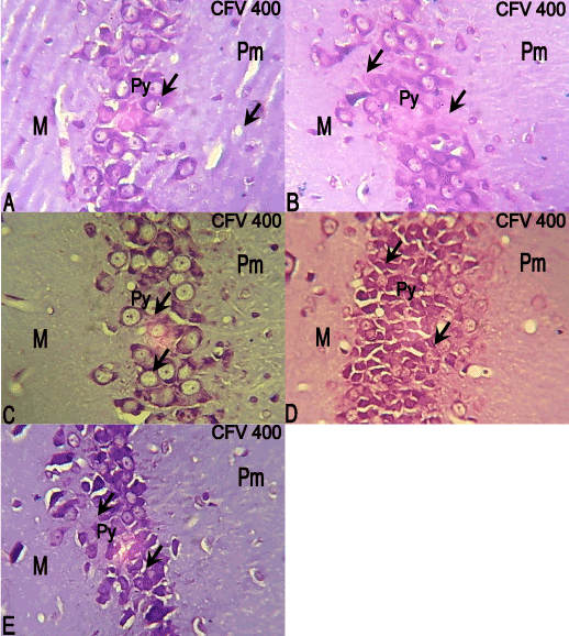 E: The hippocampus of 80mg/kg ATVS group showing pyknotic pyramidal cells (arrows).