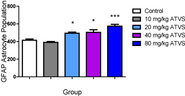 There was no difference in GFAP-labelled astrocyte population between the 10 mg/kg ATVS group, but significantly (p < 0.05) higher number of GFAP-labelled astrocytes in the 20, 40 and 80 mg/kg ATVS groups compared with the control group. The 20, 40 and 80 mg/kg ATVS groups were significantly (p < 0.05) higher than the 10 mg/kg ATVS group, while the 20 mg/kg ATVS group was significantly (P < 0.05) higher than the 80 mg/kg ATVS group. However, there was no difference between the NSE-labelled cell population of the 20 mg/kg ATVS and the 40 mg/kg ATVS groups, as well as between the 40 mg/kg ATVS and 80 mg/kg ATVS groups (Figure 9).