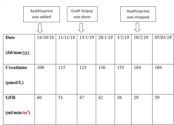 A month after starting azathioprine, it was noted that her graft function was deteriorating from a baseline serum creatinine of 100µmol/l, to 184µmol/l, as shown in Table 1.