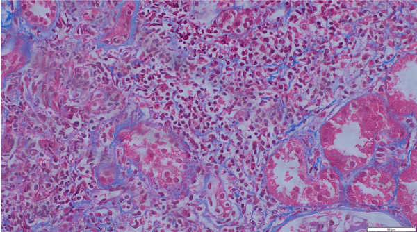Figure 1. Masson trichrome stain; x400 interstitial inflammation rich in eosinophils