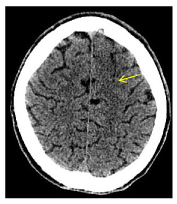 Figure 4. Axial cranial CT shows subtle cortico-subcortical hypodensity in the left anterior frontal lobe with adjacent effacement of the sulci.