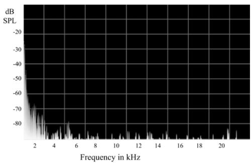 Figure 1. Power spectrum of the frequencies within the standardized auditory signal, which was applied to the guinea pigs for 90 days (16 h per day). Centre frequency of the inserted intra-cochlear electrodes are: E1=333 Hz, E2=455 Hz, E3=540 Hz, E4=642 Hz, E5=763 Hz