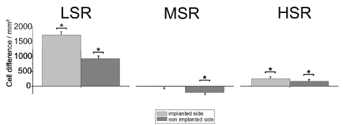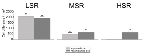 The histological data of the experimental groups and the controls were analysed by comparing the cell densities obtained from the implanted and non-implanted sides (t-/u-test respectively, depending on data distribution). The significance level for all statistical tests was p<0.05. A Bonferroni alpha-correction was applied for multiple comparisons.