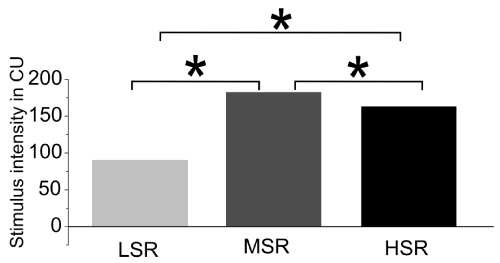 Figure 6. Stimulus intensity of the three experimental groups in clinical units (CU). LSR=low stimulation rate group; MSR= medium stimulation rate group; HSR= high stimulation rate group