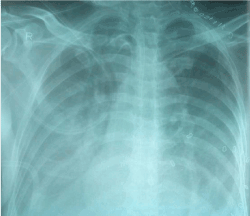 Following surgery patient was allowed with Ryles tube feeds from POD-1. On POD 3 patient developed tachypnea, chest pain, and fever with respiratory difficulty. His chest x ray showed bilateral pleural effusion with collapse of lungs (Figure 1). Ultrasonography revealed gross pleural effusion on both sides. However, compression ultrasound of both lower limbs did not reveal any features of deep vein thrombosis (DVT).