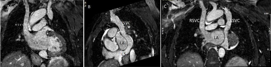 Figure 1A, B &C: Whole heart T2 prep MRI Imaging of 45-year-old adult patient showing bilateral superior vena cavae with right superior vena cava draining to left atrium and left superior vena cava draining to right atrium via dilated coronary sinus.