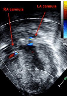 Cannula placement was also a challenge given chronically elevated right ventricular systolic pressure causing hypertrophy and decreased cavity size. This prevented placement of a right ventricular inflow cannula. Left ventricle morphology was normal (i.e. it was not dilated as is the case with most cardiomyopathies), which was also not amenable to cannula placement. Inflow cannula for both the right and left side were placed into bilateral atria allowing for unrestricted blood flow. While previously reported in the literature, this mechanism has been associated with a higher rate of neurologic injury, especially in small patients, which led to now, routine apex cannulation [9]