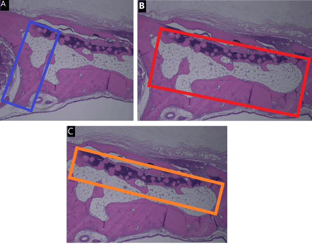 Figure 3. Description of the methods of histometric analysis. New bone formation was evaluated in an area demarcated by an arbitrarily selected 1-mm segment within the irradiated zone and a parallel straight line 3 mm from it (A). The ratio of soft tissue was determined based on an area surrounding a 4-mm diameter of the irradiated zone and a parallel straight line drawn between the native bone 2 mm from it (B). The ratio of soft necrosis was determined based on an area surrounding the 4-mm diameter of the irradiated zone and a parallel straight line drawn between the native bone 1 mm from it (C)