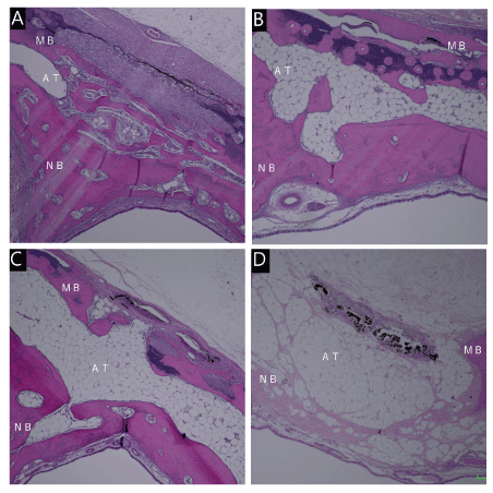Figure 6. Micrograph 16 weeks after irradiation. Energy density of 88 J/cm2(A). Energy density of 220J / cm2(B). Energy density of 441J / cm2(C). Energy density of 61J / cm2(D). Hematoxylin-eosin staining, original magnification ×40, MB:mother bone, NB:new bone. AT:Adipose tissue