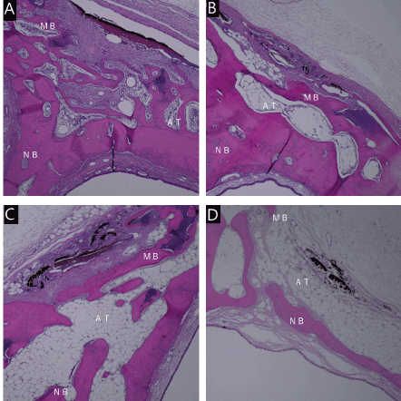 Figure 5. Micrograph 8 weeks after irradiation. Energy density of 88 J/cm2(A). Energy density of 220J / cm2(B). Energy density of 441J / cm2(C). Energy density of 61J / cm2(D). Hematoxylin-eosin staining, original magnification ×40, MB:mother bone, NB:new bone. AT:Adipose tissue