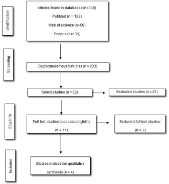 We identify a total of 339 articles from the database search, and after initial screening based on the title and abstract, 11 references were selected for further reading. Unfortunately, we excluded seven paper because they did not comply the eligibility criteria and one because it did not use a control group with healthy individuals. Thus, a total of four studies were included for qualitative analysis (Figure 1).