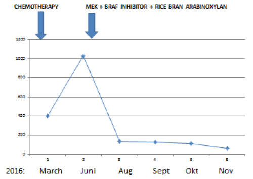 Figure 2. Rapid improvement of CEA tumor marker after the start of a treatment with 1x2 mg trametinib (MEK inhibitor) and 2x150 mg dabrafenib (BRAF inhibitor) combined with daily 45mg/kg standardized rice bran arabinoxylan immunomodulator (Biobran).