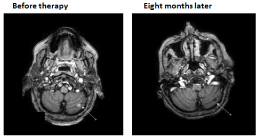 Figure 3. MR investigations represent a complete remission of a brain metastasis (in cerebellum) after a treatment with 1x2 mg trametinib (MEK inhibitor) and 2x150 mg dabrafenib (BRAF inhibitor) combined with 45mg/kg standardized rice bran arabinoxylan immunomodulator (Biobran).