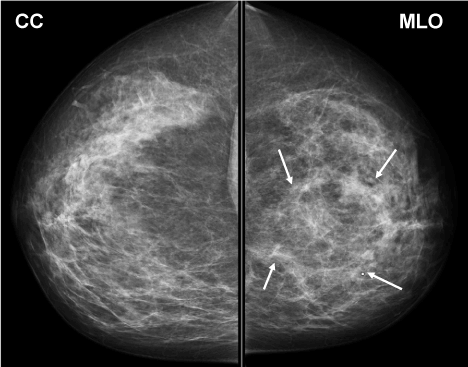 Figure 2. Pretreatment Diagnostic mammogram. Arrows denote the margins of the mass