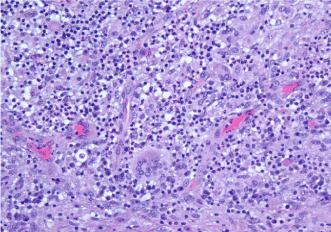 A four-week course of high-dose steroids was completed with near-complete resolution of the palpable lesion and clinical symptoms. The residual lesion was excised completely (Figure 3) with negative margins. Histopathology (Figure 4) was consistent with the previous biopsy and confirmed diagnosis of IGM. The patient remains asymptomatic 10 months after surgery.