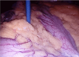 After diagnosis, the foreign body was slowly removed inferomedially from the liver and the stomach wall and extracted by 10 mm trocar. The perforated stomach was saturated with single separated sutures. Liver fissure was closed by single absorbable suture. Rinsing, aspiration and placement of tube drain finalized the operation (Figure 3).