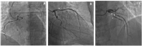 Figure 1. Basal coronary angiography of Case-1, showing hypoplastic RCA (Panel A), dominant LCX without significant stenosis (Panel B) and LAD with long sub-occlusion and bifurcating with a first diagonal branch and a septal branch compatible with “dual” LAD (Panel C).