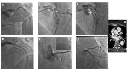 Figure 2. Case-1: PTCA balloon dilation in LAD stenotic segment and guidewire to protect the septal large branch by the mean of a microcatheter (→) (Panel A). Retrograde spiral dissection of the LAD (*) (Dunning Classification Type II; Panel B). Stenting of septal branch and proximal LAD segment (…) (Panel B/C). Stenting of left main up to aortic root origin (Panel D). Extension spiral dissection and occlusion of LCX from the ostium (→) (Panel E). Successful and complete closure of the dissection tear associated to TIMI 3 flow (Panel F). Angio-CT scan demonstrated complete sealing of aortic dissection with complete stent patency () (Panel G) before discharge.