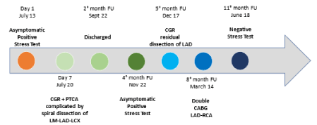 The appropriate therapeutic strategy for iatrogenic dissections remains variable being generally based on the type of dissection and the hemodynamic stability of the patient. However, it is always useful to develop a mental algorithm for management strategy. First, since contrast media will preferentially circulate in the false lumen, the operator should immediately minimize injections due to the fact that further injections may promote expansion of the dissection. Thus, if contrast checks are needed, reduction of injection pressure (< 600 PSI), injection flow (< 3 ml/s) and contrast volume (< 5 ml), it is recommendable. Second, it is essential to be prepared for patient’s hemodynamic destabilization. In the case examples we showed herein, Case-1 was characterized by hemodynamic stability which gave to the operating team the time to protect large branches originating from the LAD, seal the LAD-LM-aortic root dissection and finally re-open the LCX. In Case-2, abrupt hemodynamic compromise associated to VF storm made impossible to immediately re-open the left coronary three. In this situation, hemodynamic stabilization should be first accomplished and only after that, injury of the coronary artery sealed. In both cases it’s suggested to perform angioplasty with an expert operator, as we did it in our experiences. Third, in order to re-open the vessels involved in the dissection, it is recommended to utilize intravascular ultrasound (IVUS) since it could help to confirm the correct wire position in the true lumen and to assess the extension of intramural haematomas [11]. However, once the dissection has occurred, the clinical picture may vary depending on the remaining antegrade coronary flow, and it can range from an asymptomatic patient, as in Case-1, to a patient in refractory cardiogenic shock, as in Case-2 [12,13]. Some authors have proposed that in all cases where there is dissection of the coronary sinus, the ostium should be sealed immediately by stenting [14]. Others have proposed that surgical intervention should be considered if the dissection extends to 4 cm or beyond into the aorta [3,15].  In case of LM dissection, it is also possible to maintain the guiding catheter into the false lumen and utilize a second guiding catheter to facilitate true lumen wiring [16].  A management strategy to treat iatrogenic coronary spiral dissection is proposed in (Figure 6). It is important to remember that in case of anterograde dissection extending to distal vessel segments, it is difficult for the heart surgeon to choose the correct landing zone for the distal anastomosis and is therefore recommendable a “keep-calm and carry on” strategy in order to percutaneously re-open the vessel (usually with a “mini-STAR” technique). On the contrary, in the presence of true distal lumen, the heart team may decide to perform either PCI or CABG.