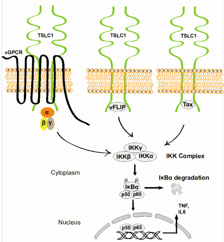 Figure 1. Chronic NF-κB activation by KSHV and HTLV-1 oncogenes. TSLC1 localized at the plasma membrane mediates viral oncogene (vGPCR, vFLIP, and Tax)-induced chronic activation of NF-κB (p50/p65) and inflammation in KSHV and HTLV-1 infected cells.
