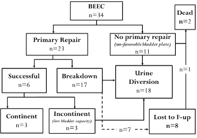 Figure 1 below summarizes the surgical journey of the 34 participants in this series. The mean age at surgery was 13 months. Eleven patients had unfavorable bladder plates and did not undergo primary repair. Three patients with favorable plates were continent after primary repair and all were female (Figure 2). The main challenges faced in those who had primary repair were; late timing of surgery, breakdown after surgery (failed repair) and incontinence after repair which was primarily due to small bladder capacity. Additionally, a total of 8 patients were lost to follow up after failed primary repair