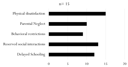 Data on 15 patients who underwent psychological assessment was retrieved. Most patients suffered from physical dissatisfaction and reserved social interactions. The results are summarized in Figure 4.