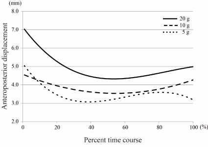 Figure 8. Polynomial curve of anteroposterior displacements over time There were significant differences in the anteroposterior displacement curves depending on rice ball weight, similar to the vertical and lateral displacements (Table 2). The anteroposterior displacement also decreased immediately after the first cycle, but then increased slightly from around the middle point of an intake, in each rice ball weight.