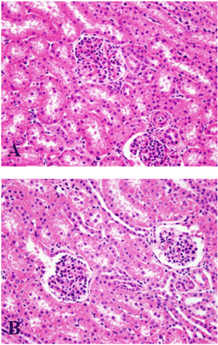 Figure 4. Microscopic effects of melamine in the kidney of barrows. Kidney from a pig fed the basal diet without MEL (control pig, A). Kidney from a pig fed the basal diet plus 1.25 % MEL (B).